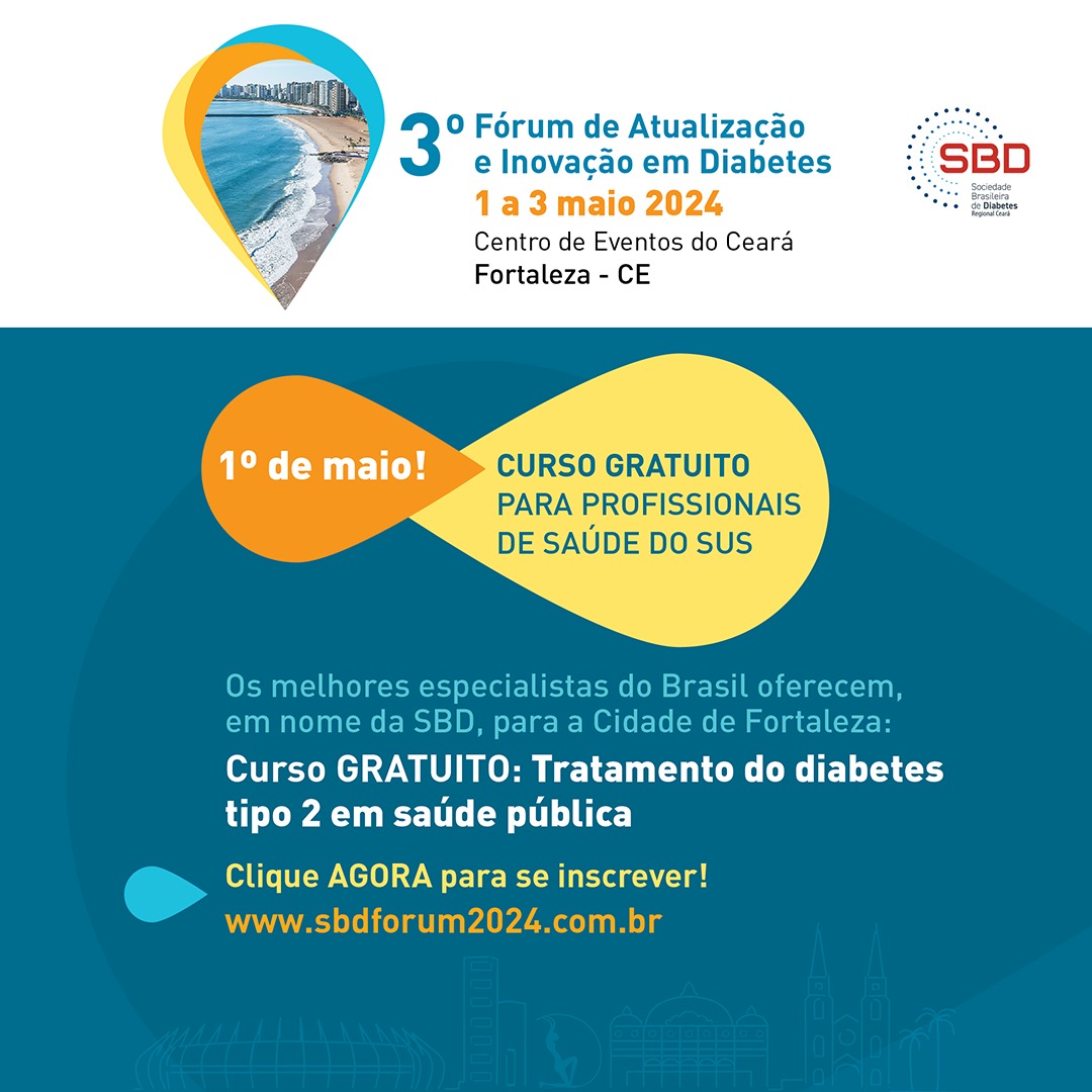 De 1 a 3 de maio a Sociedade Brasileira de Diabetes (SBD) realiza, em Fortaleza, o 3º Fórum de Atualização e Inovação em Diabetes.  No evento serão discutidos temas relevantes como Diabetes na Gestação, Diabetes e Fígado, Doença Cardiovascular no Diabetes, Exercício e Diabetes, Tecnologias e Neuropatia e Complicações nos pés, dentre outros.