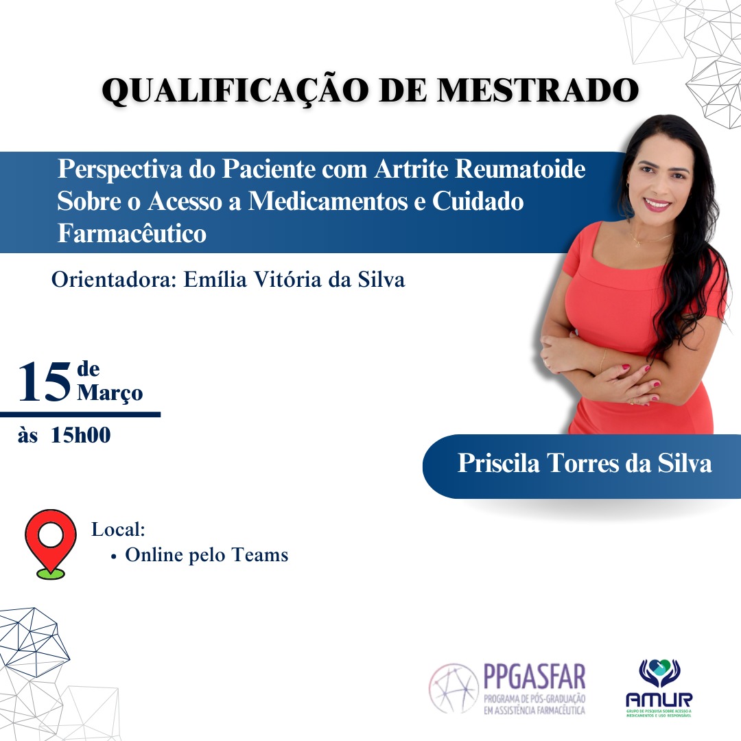Perspectiva do paciente com artrite reumatoide sobre o acesso a medicamentos e cuidado farmacêutico, é o tema do meu projeto de pesquisa do Programa de Mestrado Acadêmico em Assistência Farmacêutica que será submetido a qualificação nesta sexta-feira, 15 de março de 2024 às 15h. A qualificação será transmitida ao vivo via Microsoft Teams e será uma honra recebê-los na plateia online.