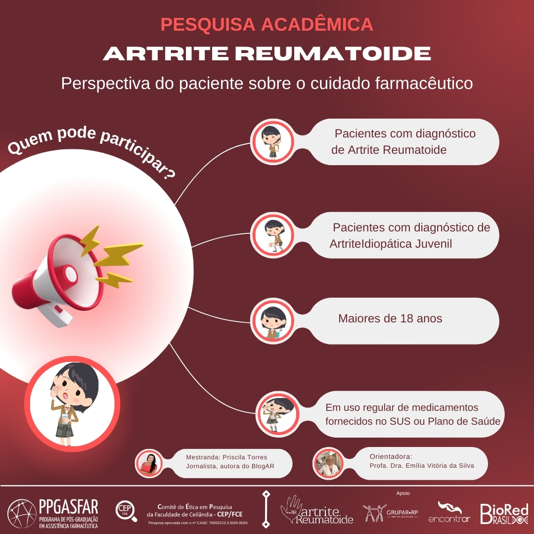 Se você convive com artrite reumatoide, tem mais de 18 anos e faz uso de medicamentos fornecidos pelo SUS ou plano de saúde, convidamos você a participar de uma pesquisa acadêmica sobre a perspectiva do paciente sobre o cuidado farmacêutico.