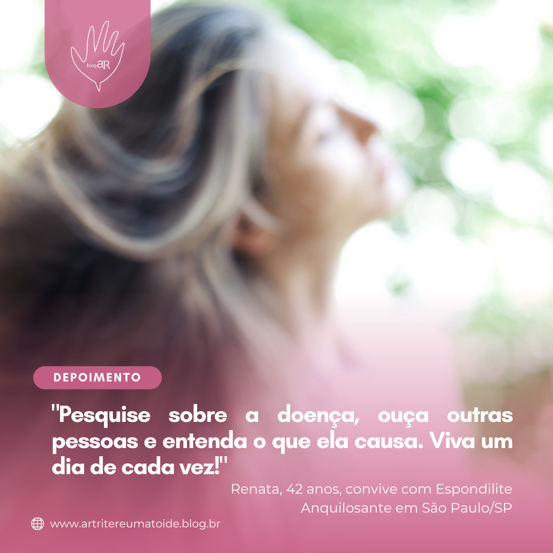 Me chamo Renata, tenho 42 anos, sou portadora de Espondilite Anquilosante e moro em São Paulo/SP.