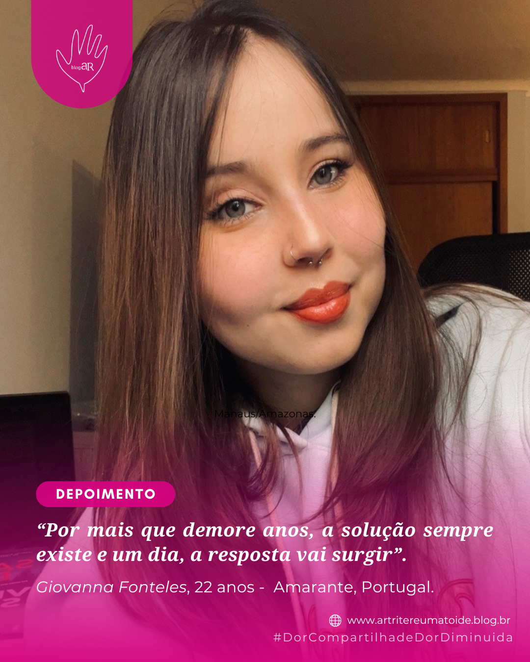 Meu nome é Giovanna Fonteles, @giifonteles_, tenho 22 anos, convivo com a Artrite reumatoide, Artrite idiopática juvenil e Artrite psoriásica desde os 8 anos de idade, sou microempresária, moro em Amarante, Portugal.