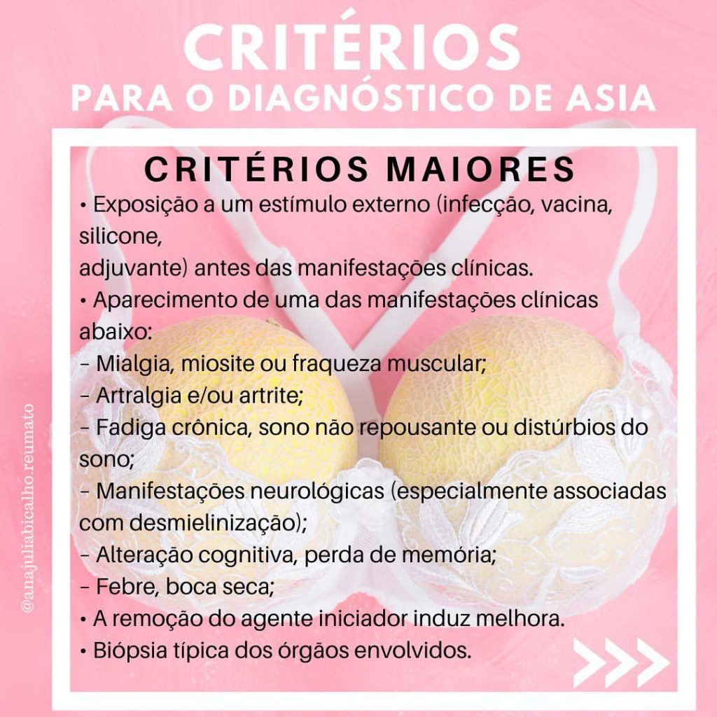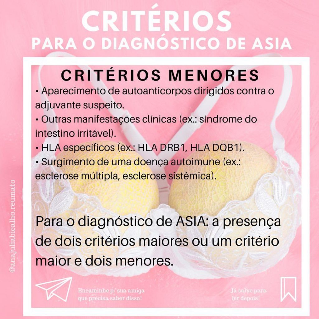 Tem sido descrita uma doença denominada ASIA, que é a sigla em inglês para Síndrome autoimune/inflamatória induzida por adjuvantes, associada a alguns procedimentos, em especial à prótese mamária de silicone. É uma doença RARA e em geral ocorre em menos de 3 anos da exposição ao adjuvante. Arraste para o lado e veja os critérios maiores e menores!