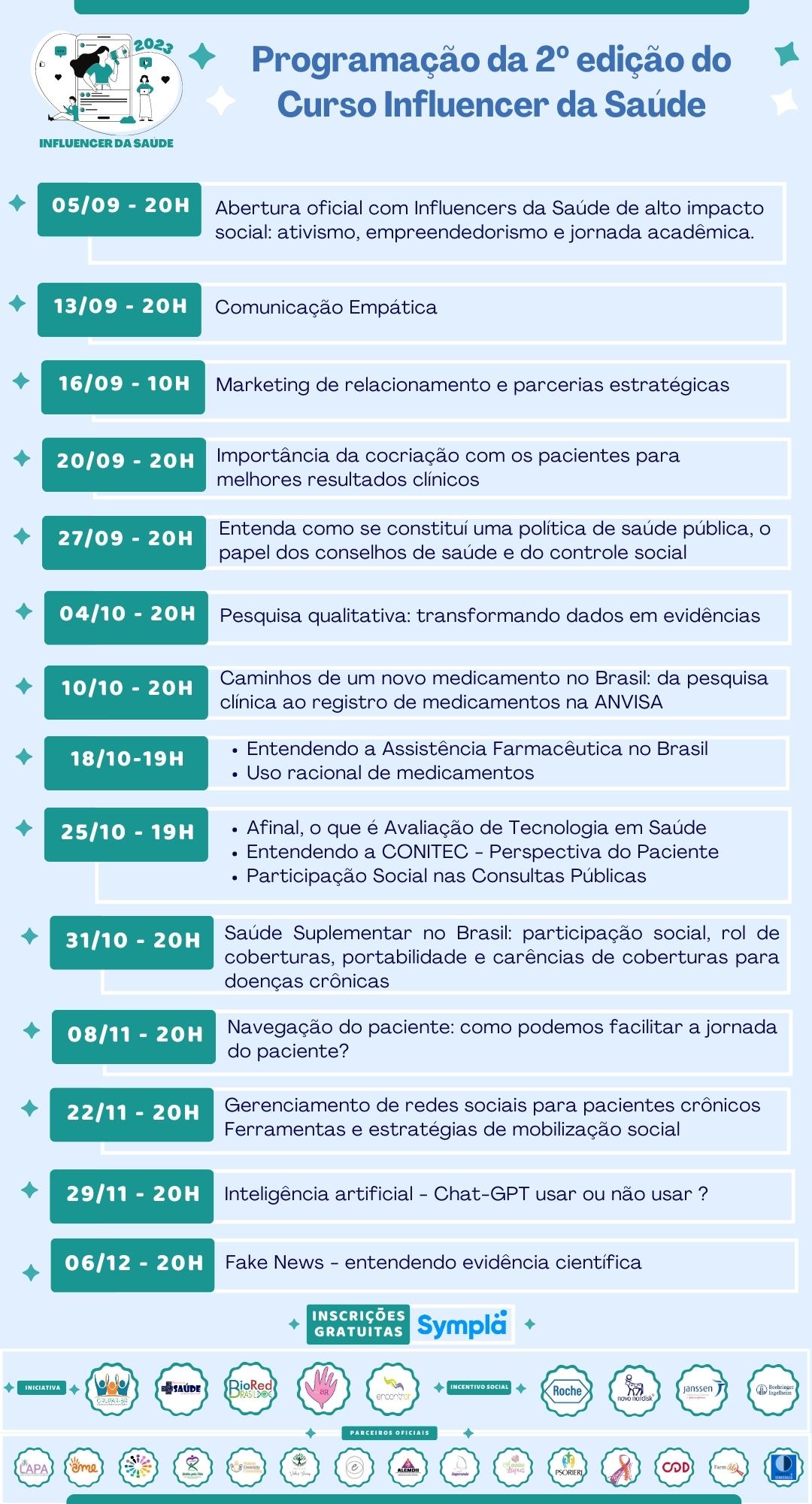 A participação é gratuita mediante inscrição no link: https://www.sympla.com.br/curso-influencer-da-saude-2023__2134844
