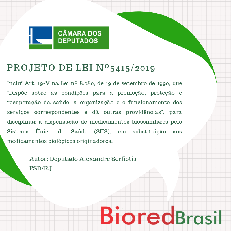 Sobre o PL 5415/2019: Inclui Art. 19-V na Lei nº 8.080, de 19 de setembro de 1990, que “Dispõe sobre as condições para a promoção, proteção e recuperação da saúde, a organização e o funcionamento dos serviços correspondentes e dá outras providências”, para disciplinar a dispensação de medicamentos biossimilares pelo Sistema Único de Saúde (SUS), em substituição aos medicamentos biológicos originadores.