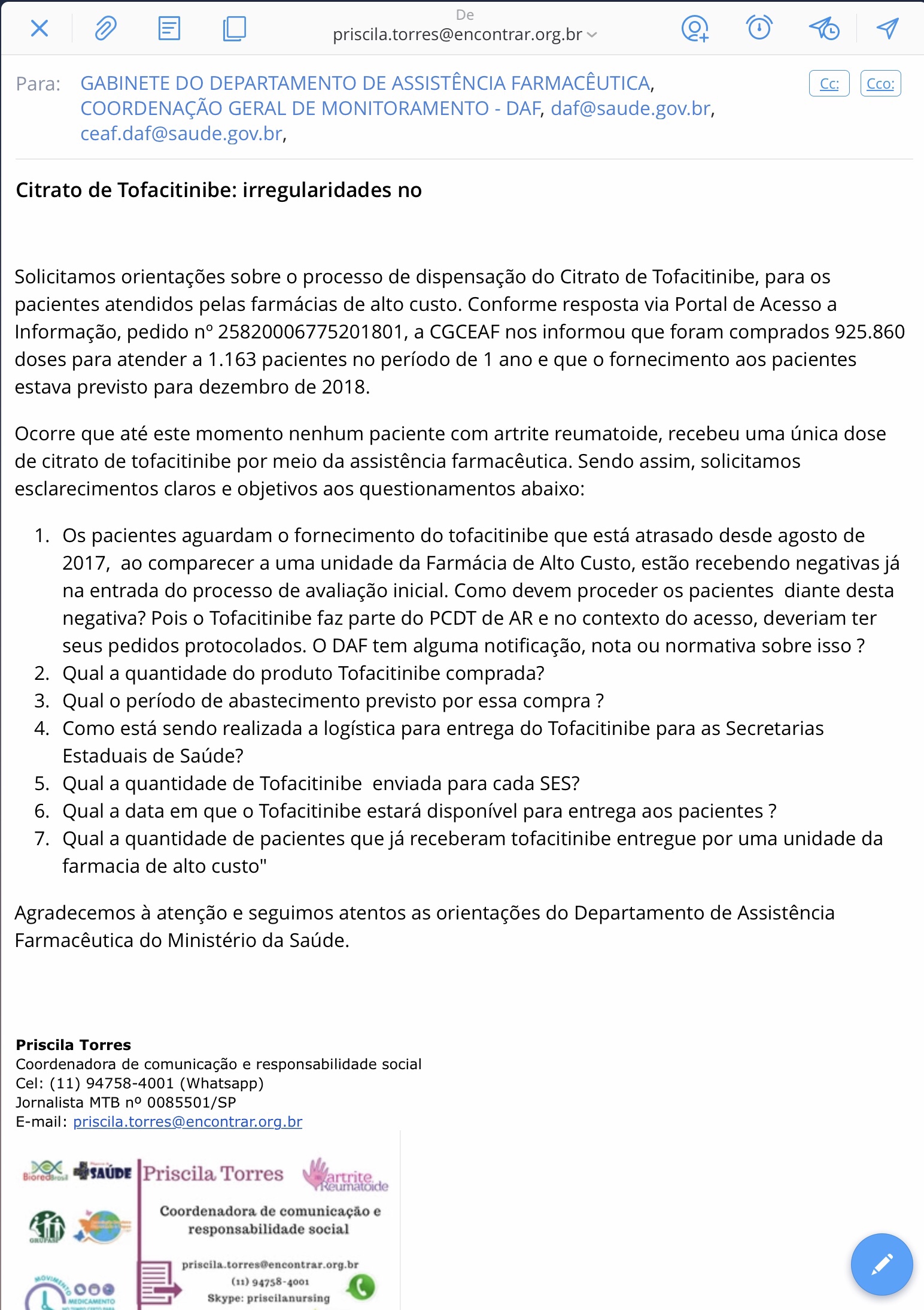 Seguimos cobrando o fornecimento de citrato de tofacitinibe por meio das farmácias de alto custo. O Departamento de Assistência Farmacêutica nos informou em novembro de 2018, que foram comprados 925.860 doses para atender a 1.163 pacientes no período de 1 ano e que o fornecimento aos pacientes estava previsto para dezembro de 2018.
