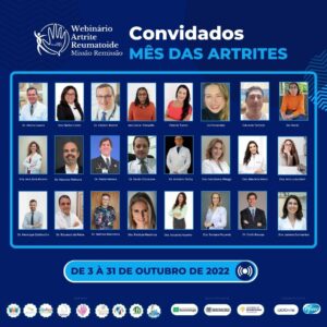 ✦ Webinário de Conscientização sobre as Artrites, acontece de 03 à 31 de outubro de 2022, uma iniciativa da Rede de Apoio aos Pacientes Reumáticos de São Paulo, composta pelo Grupo de Apoio ao Paciente Reumático Brasil, Grupo EncontrAR, Associação Brasileira Superando o Lúpus e Grupo de Apoio aos Pacientes Artríticos de São Paulo, com o apoio institucional da Sociedade Brasileira de Reumatologia, Sociedade Paulista de Reumatologia e da Sociedade de Reumatologia do Rio Grande do Sul.