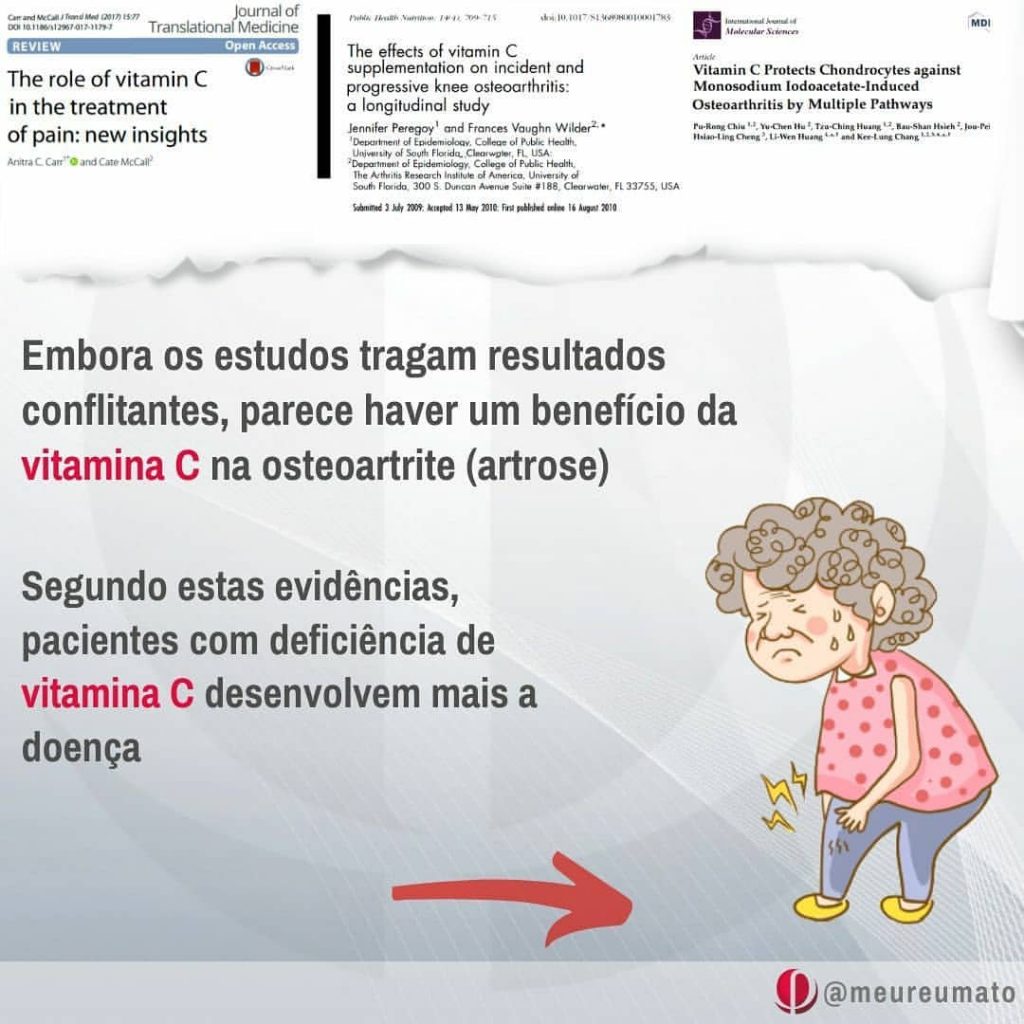- Embora os estudos tragam resultados conflitantes, parece haver um benefício da vitamina C na osteoartrite (artrose).