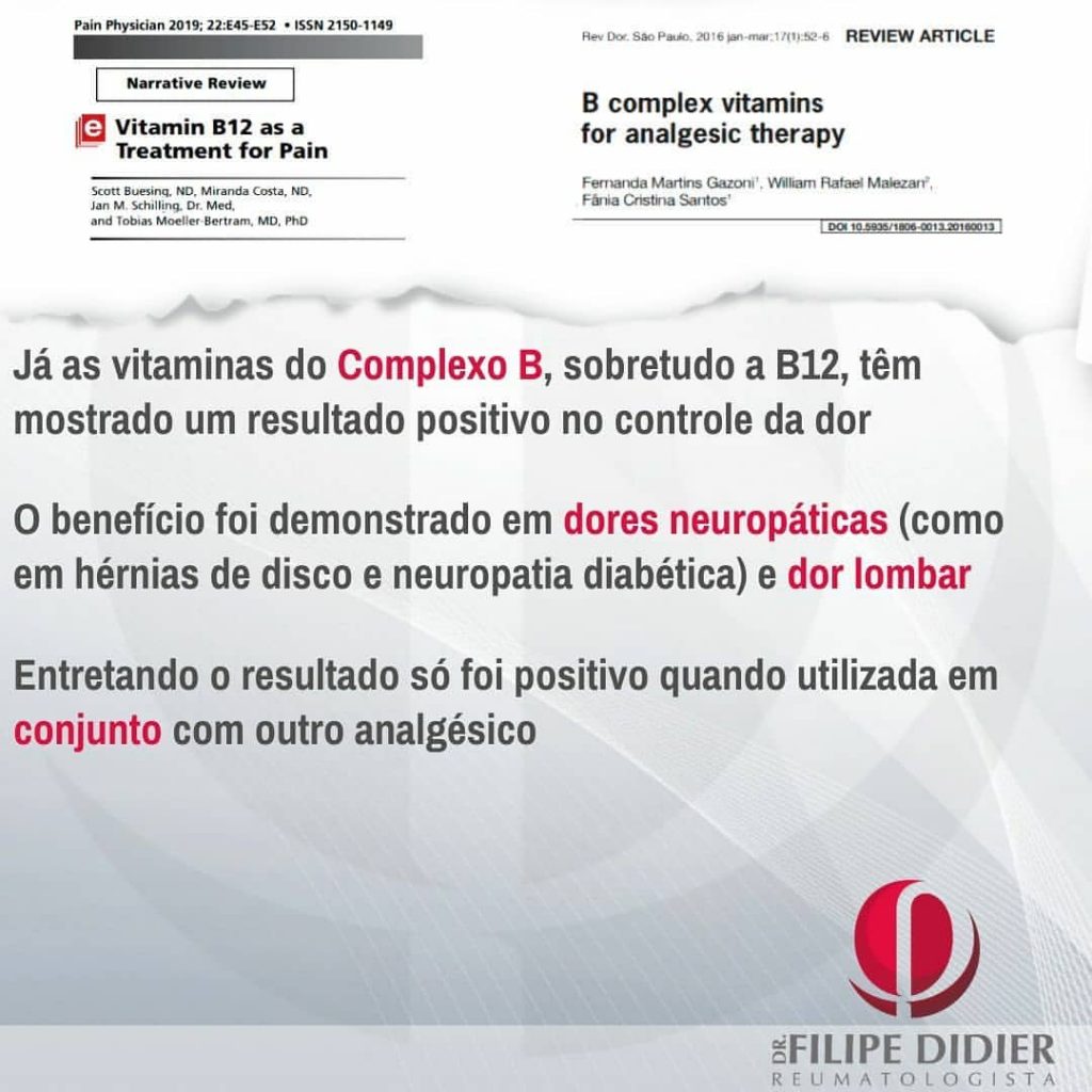 - Já as vitaminas do Complexo B, sobretudo a B12, têm mostrado um resultado positivo no controle da dor.