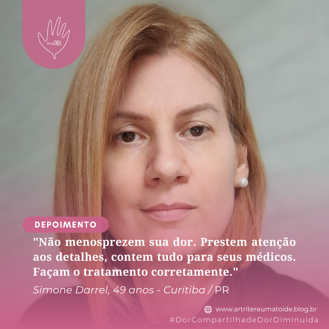 Me chamo Simone Darrel, tenho 49 anos, convivo com o diagnóstico de Artrite Psoriásica à 9 meses, sou Estudante de Nutrição, e moro em Curitiba no estado do PR.
