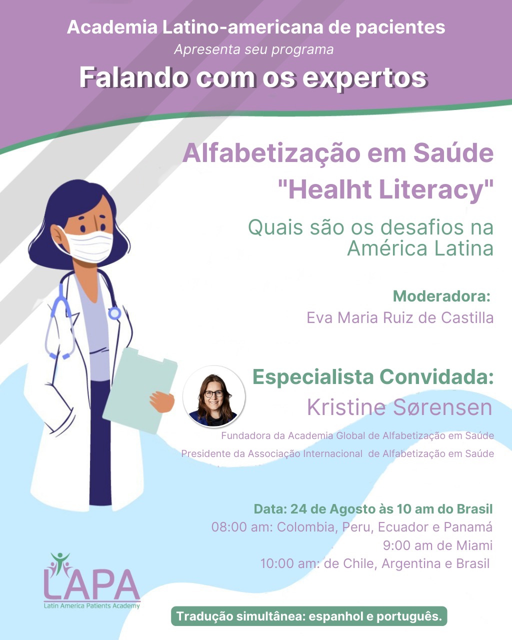 No dia 24 de agosto às 10 horas, a Academia de Pacientes da América Latina (LAPA), realizará o Webinar: Alfabetização em Saúde quais são os desafios na América Latina. O Webinar será apresentado por Kristine Sørensen, fundadora da Academia Internacional de Alfabetização em Saúde e presidente da Associação Internacional de Alfabetização em Saúde. A participação é gratuita, mediante inscrições no link: https://us02web.zoom.us/webinar/register/WN_ScTfGdRgTDmbaV5cUmgH7g