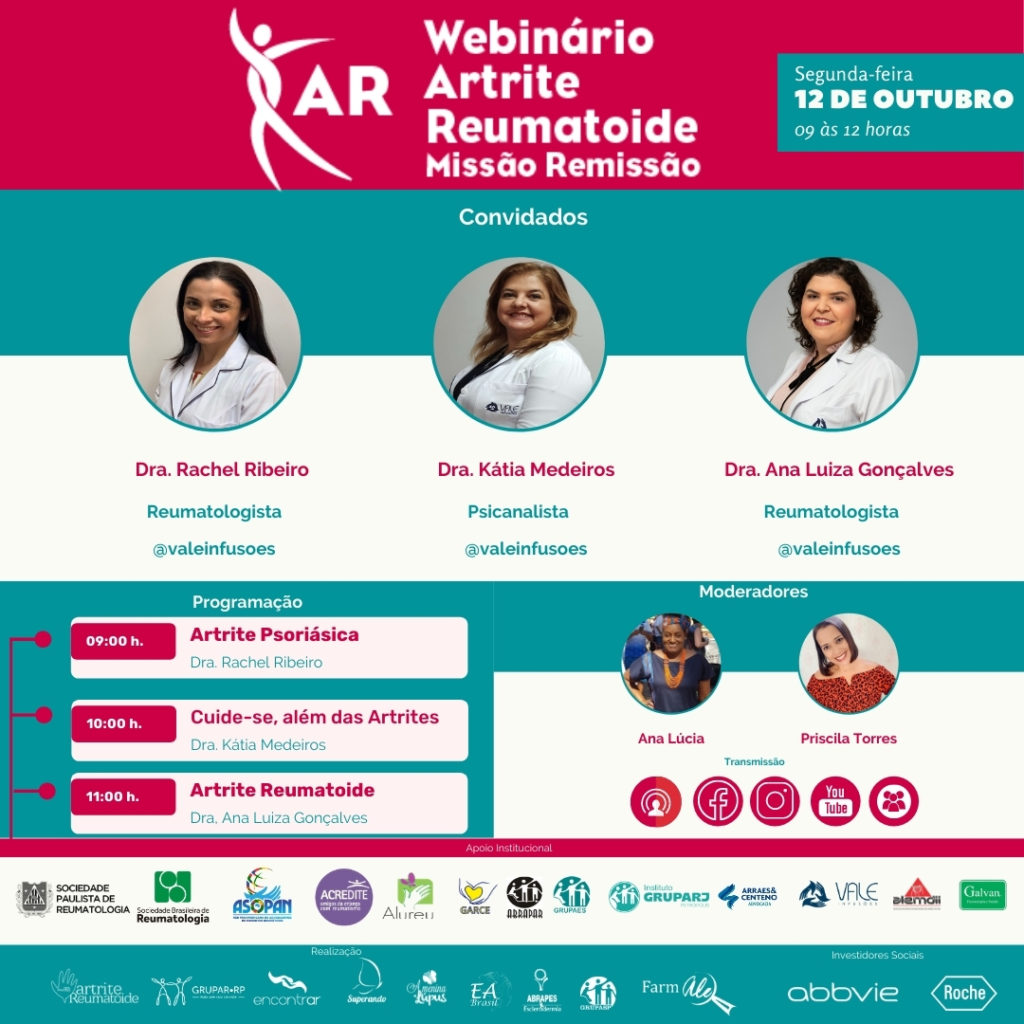 Webinário sobre Artrite Reumatoide e Artrite Psoriásica, acontecerá durante o dia 12 de outubro de 2020 das 09 às 12 horas, confira a programação: